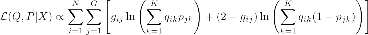 The equations below are analogous to the single-population equations presented above, except that now the probability of observing each allele is a weighted average of the probability of the allele coming from any possible source population. We sum the allele frequency over all source populations, multiplying by the sample's probability of membership to that ancestral population (qik).
